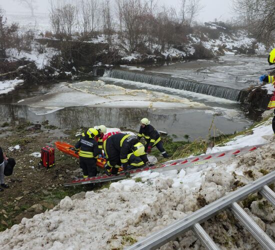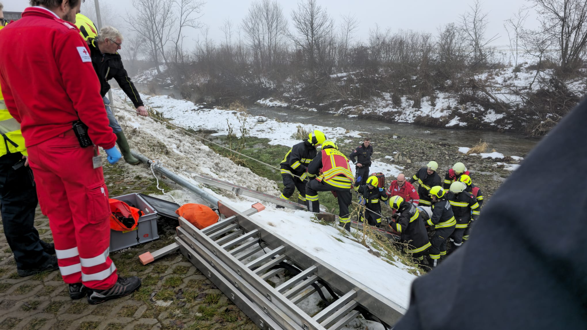 Unsere Aufgabe war es die Person über die steile und rutschige Böschung zu retten. Hierzu legten wir eine Rutsche mit unseren Steckleitern. Mittels Spineboard und Korbschleiftrage wurde die unterkühlte Person über die Steckleiter nach oben gezogen und dem Rettungsdienst übergeben.
